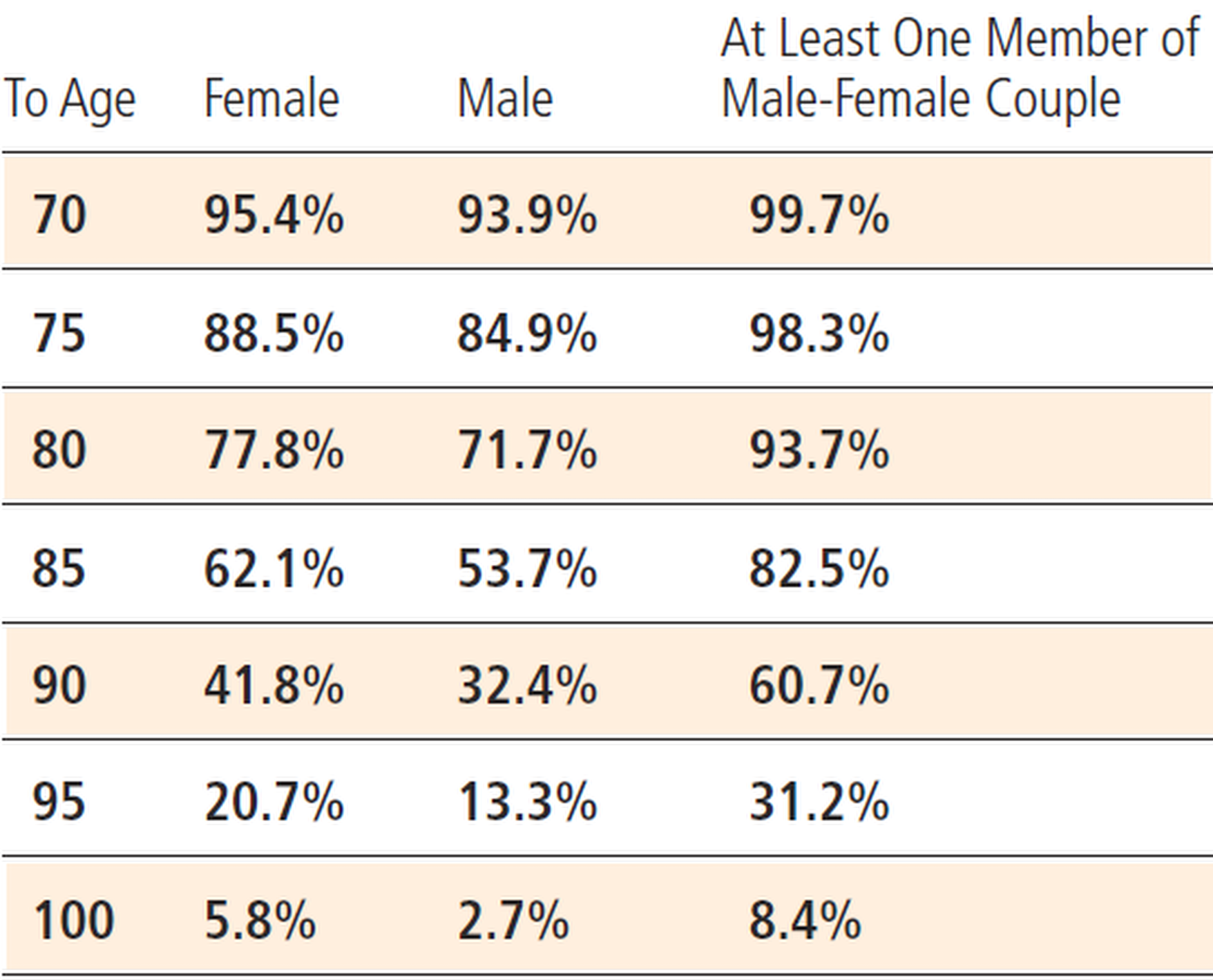 For example, the chance that at least one member of a couple survives to age 85 is 82.5%; the probability that one spouse or even both are alive at age 90 is three in five.