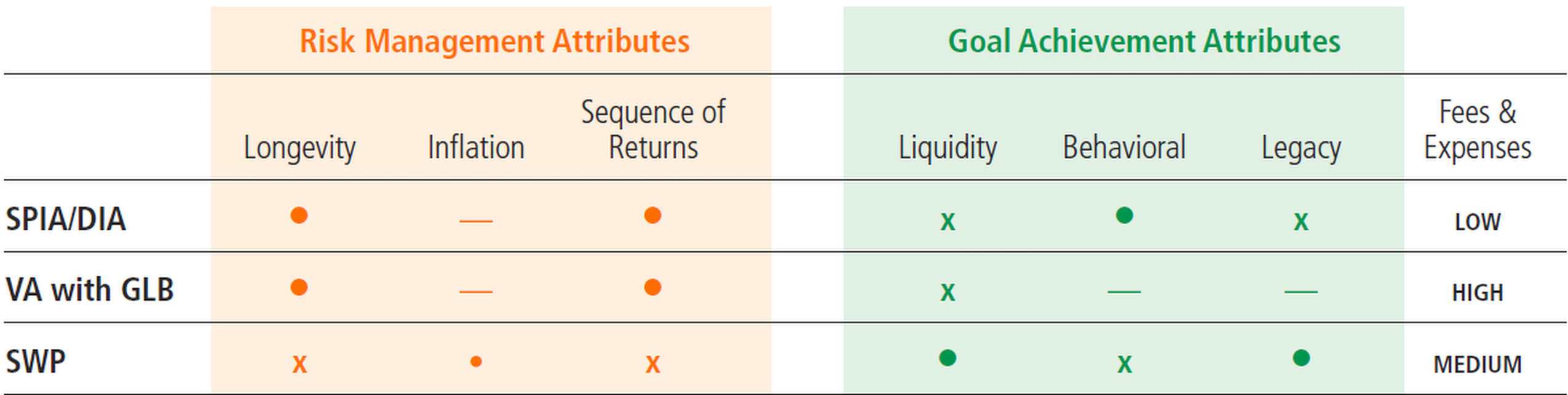 Each product varies in its effectiveness at addressing the risks and retirement goals of a retiree, which may include maintaining liquidity, maximizing estate value, or increasing sustainability. There is no ‘free-lunch’ — valuable benefit offered by a product is typically offered at the expense of another risk management attribute.